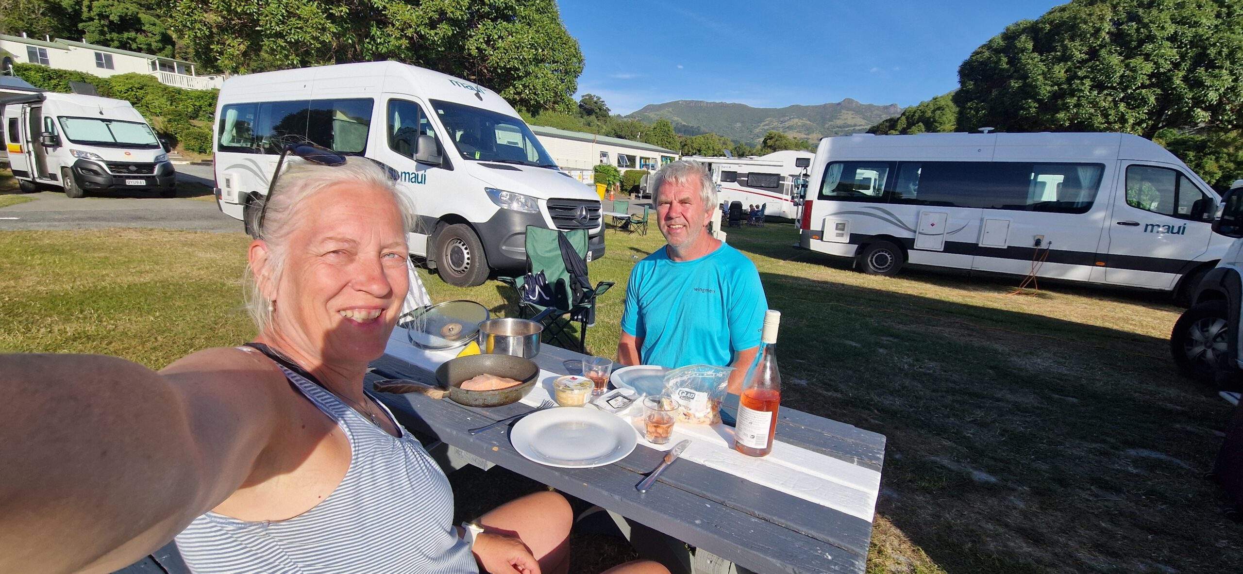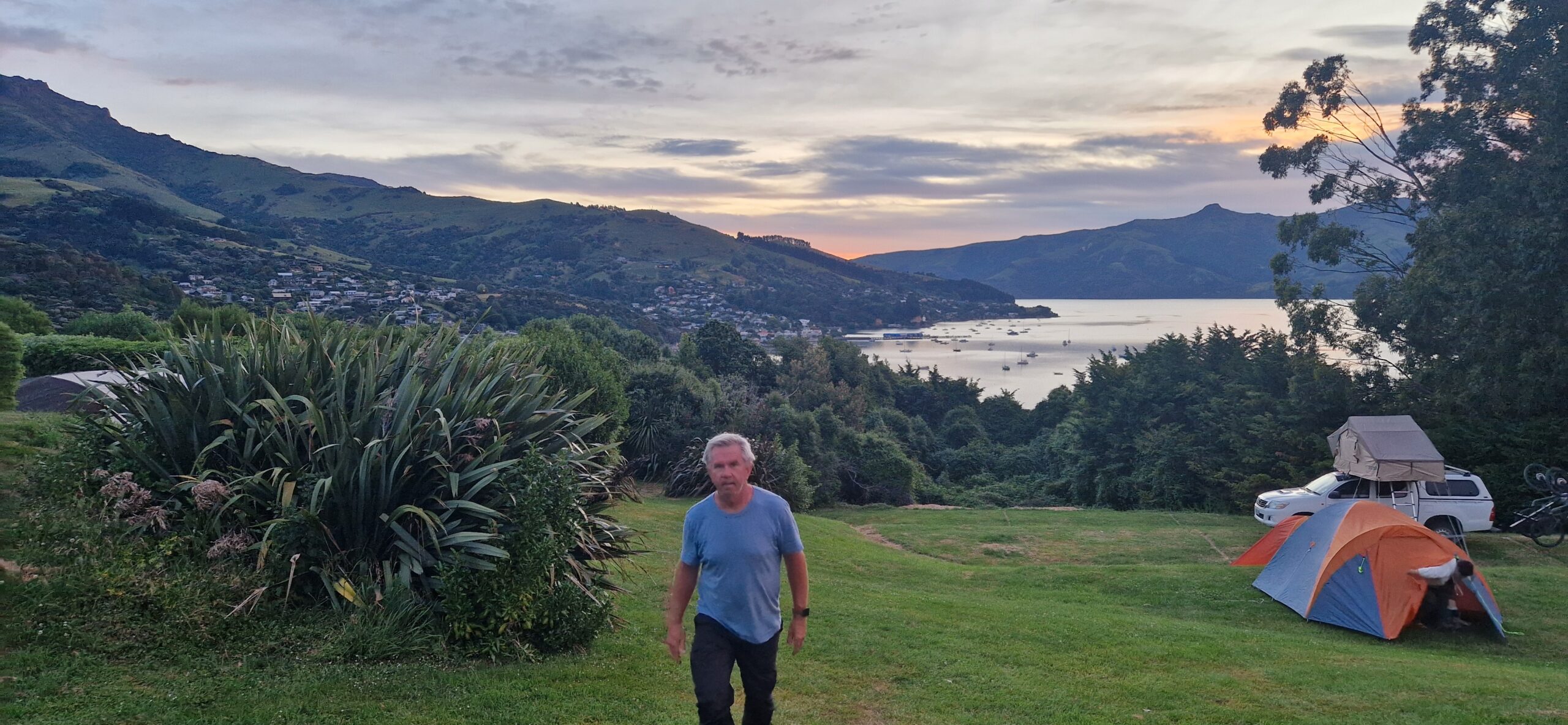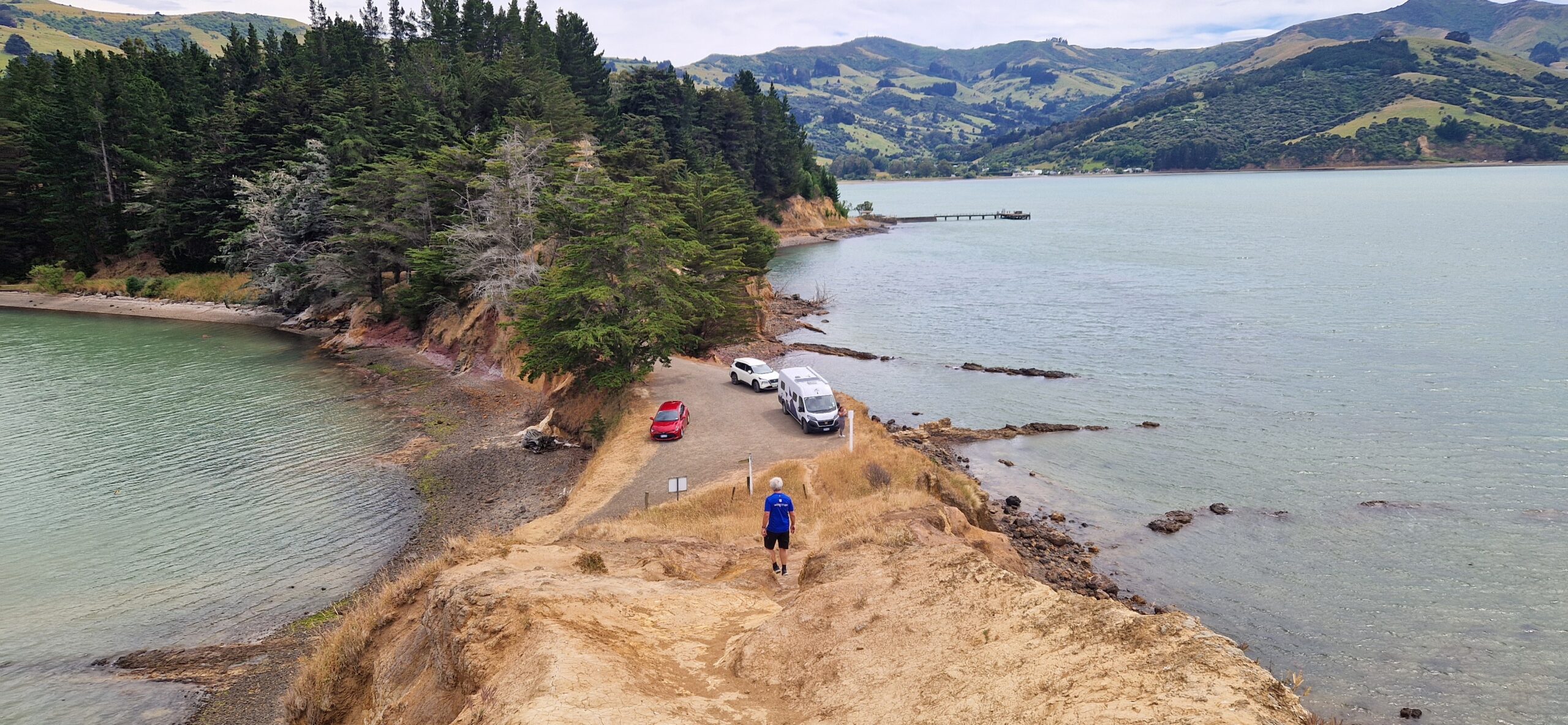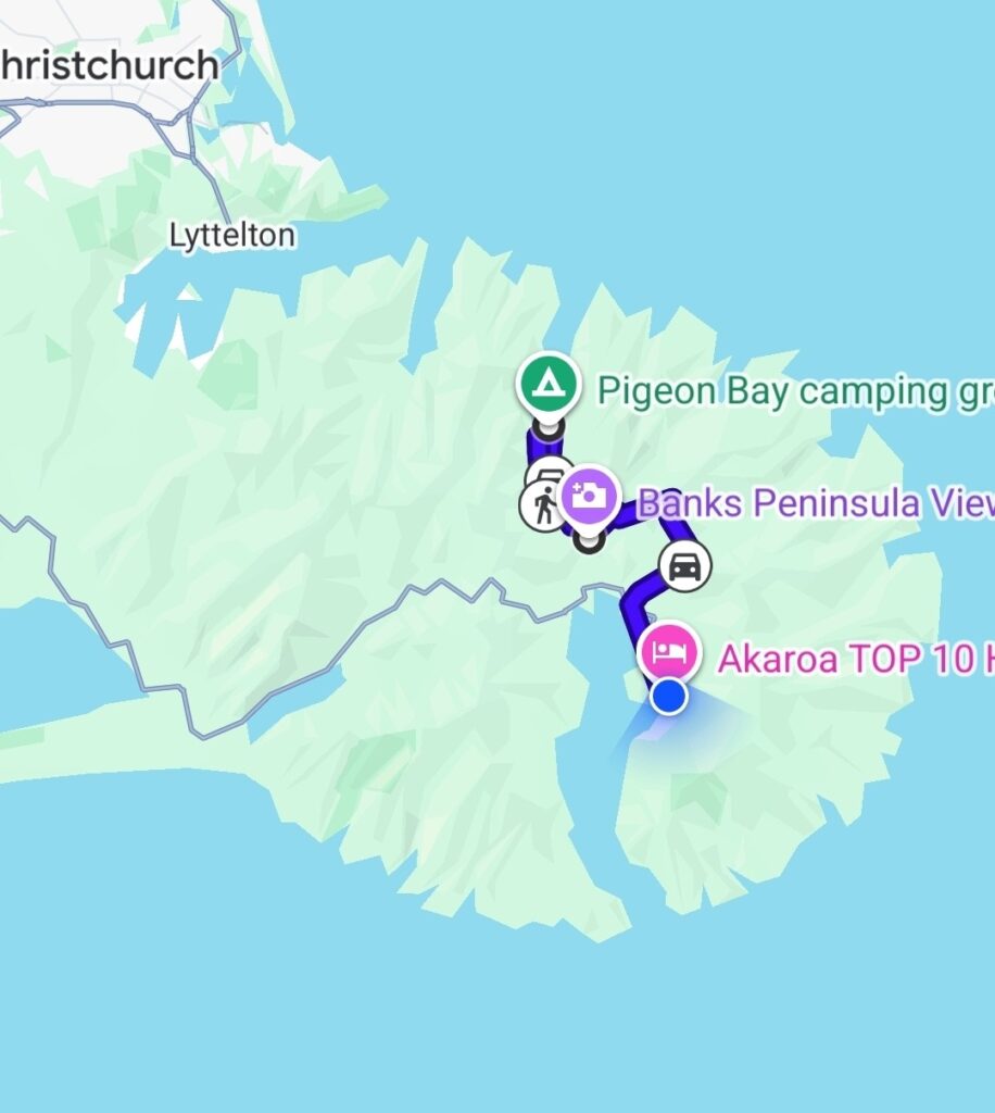 Vi skulle blot på den anden side af halvøen, til Akaroa, op over bjerge med en del hårnåle sving. Til den sammeplads som vi begyndte med her på sydøen.