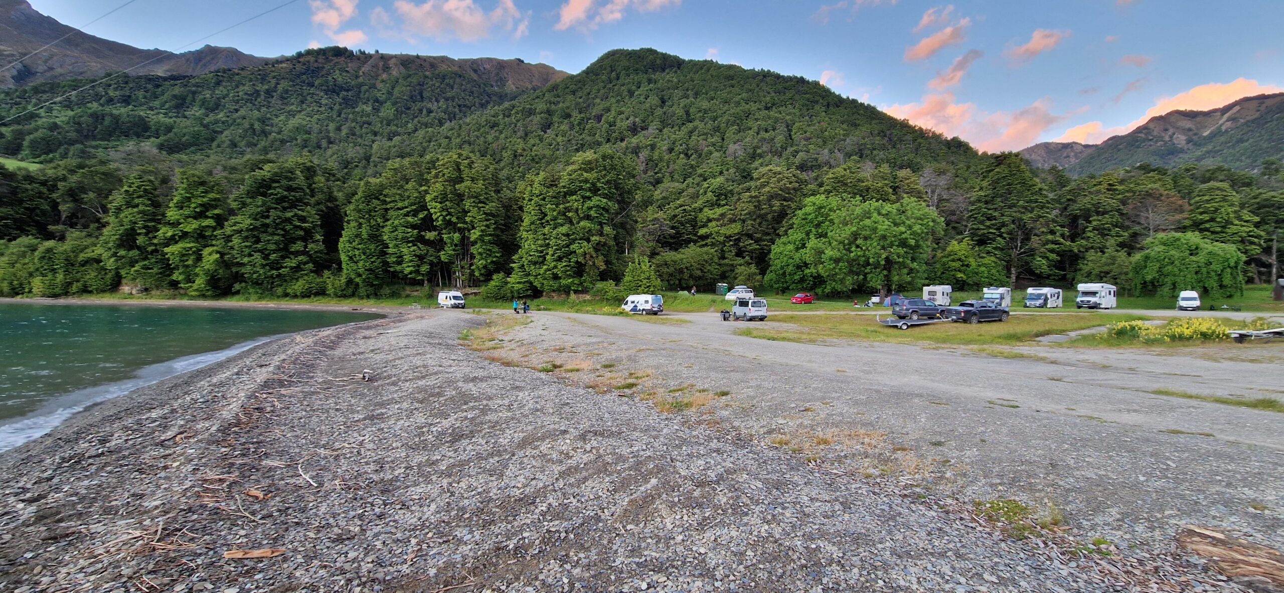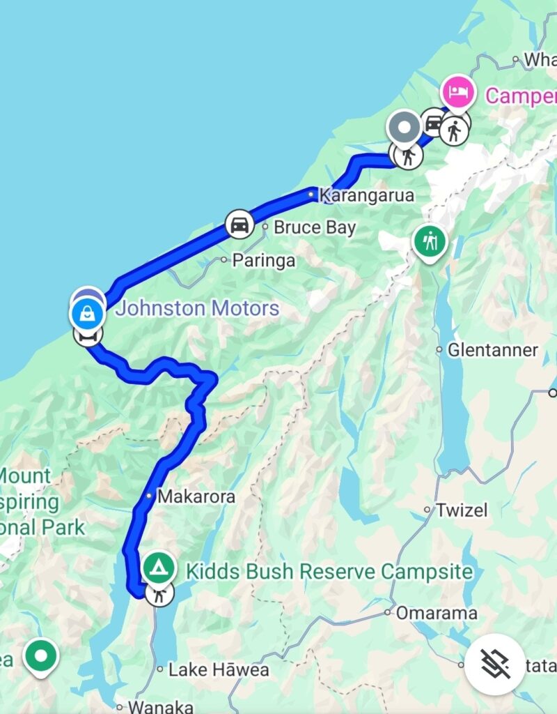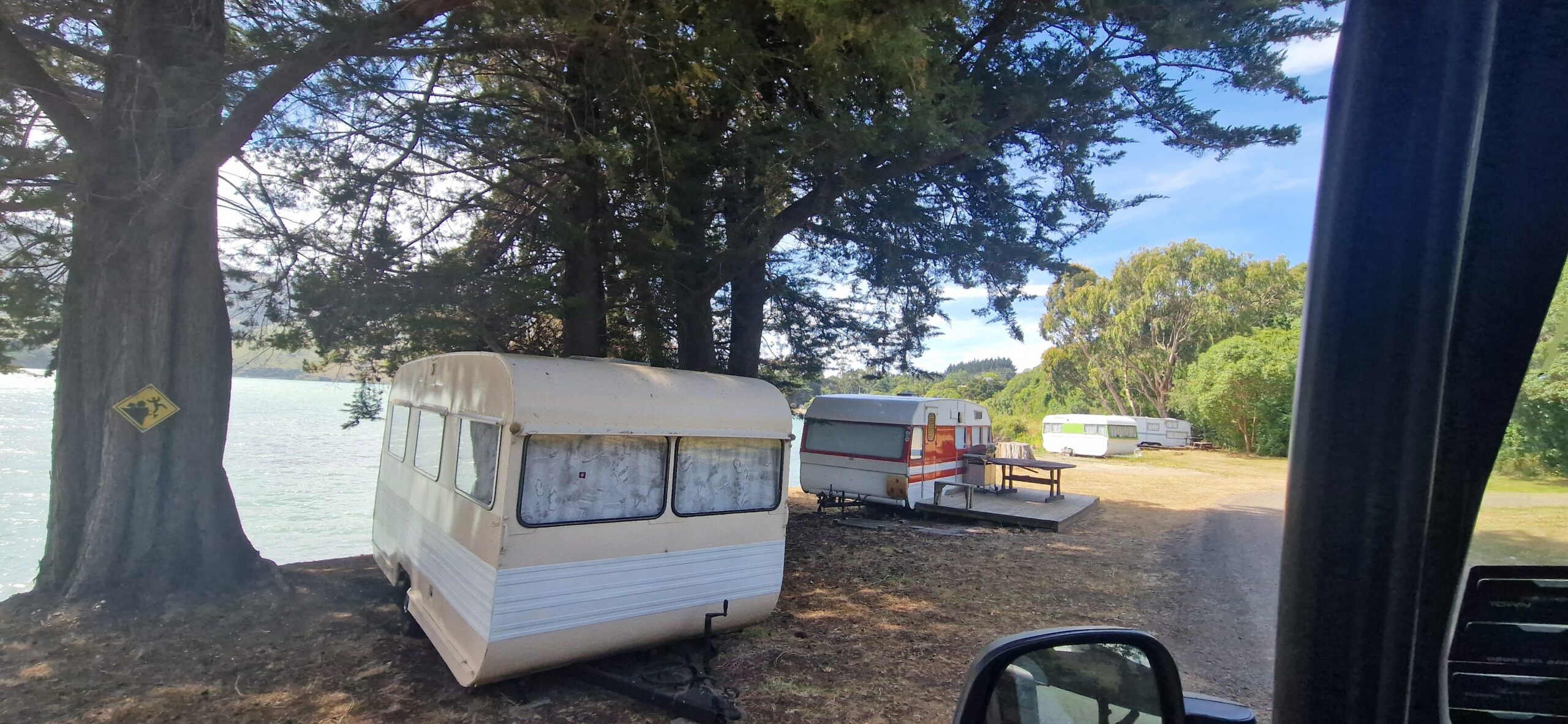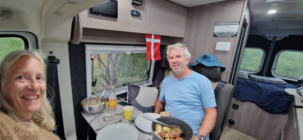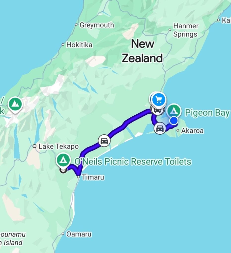 Vi overnattede på en billig camp (Pigeon bay camp), uden el og vand – det var ikke noget problem, og uden afløb og det var et problem da vi skal aflevere autocampere i morgen – tømt.
