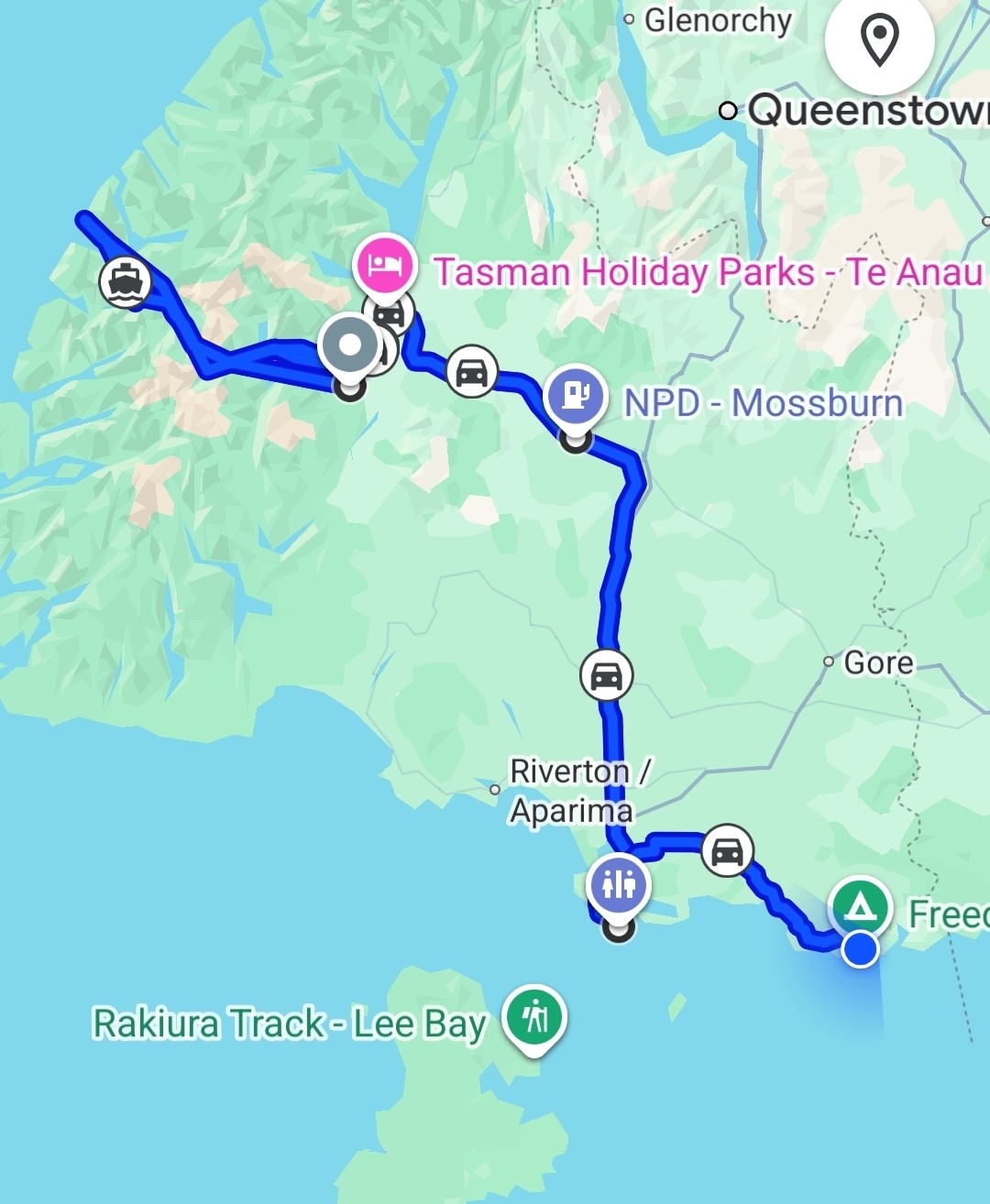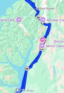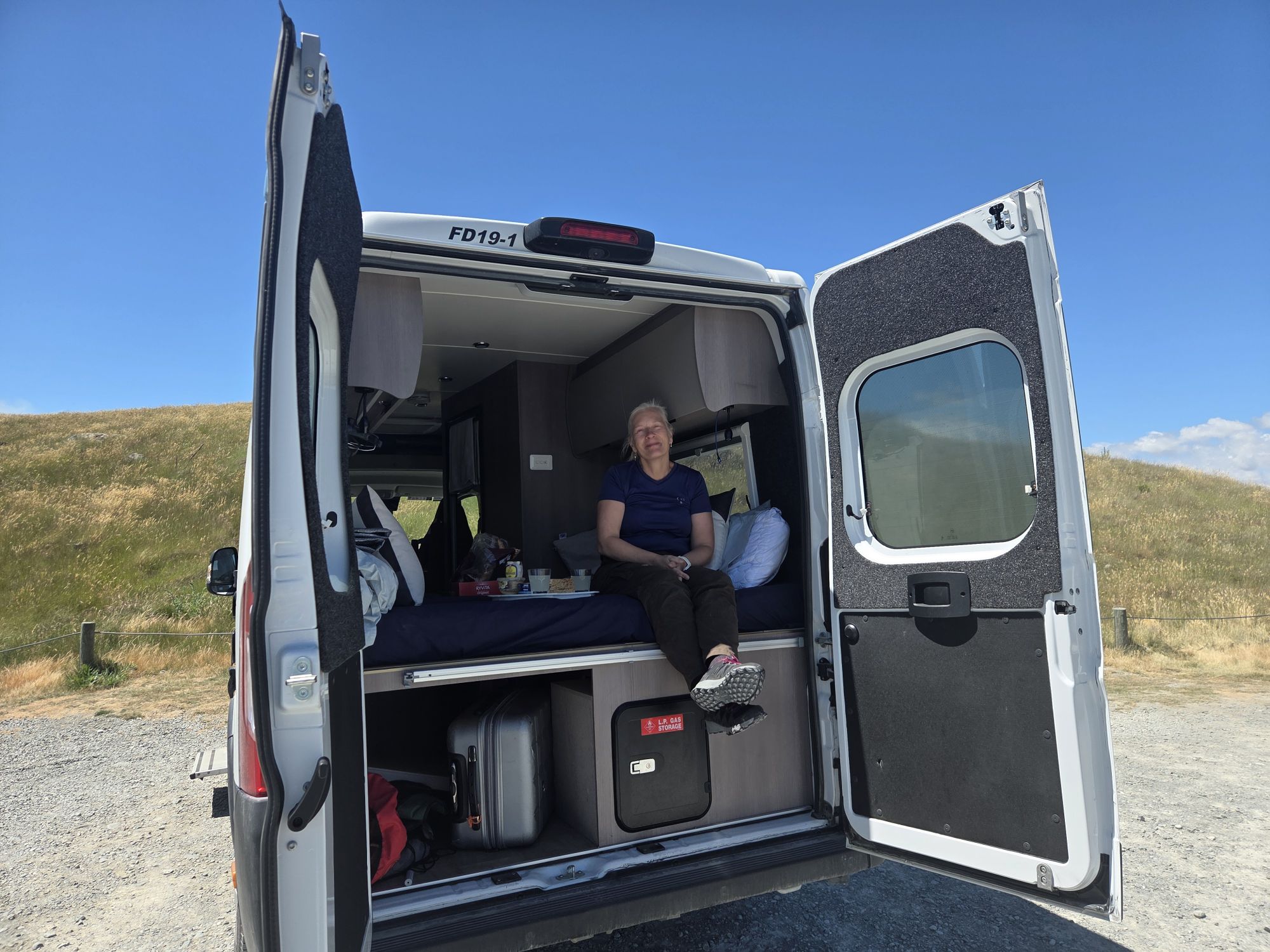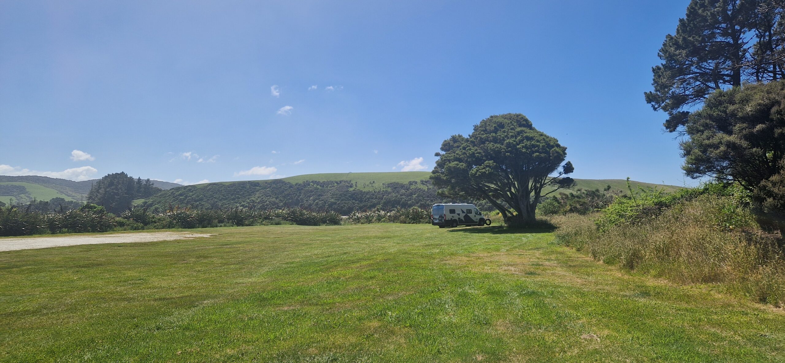 Vi overnattede på en billig camp (Pigeon bay camp), uden el og vand – det var ikke noget problem, og uden afløb og det var et problem da vi skal aflevere autocampere i morgen – tømt.