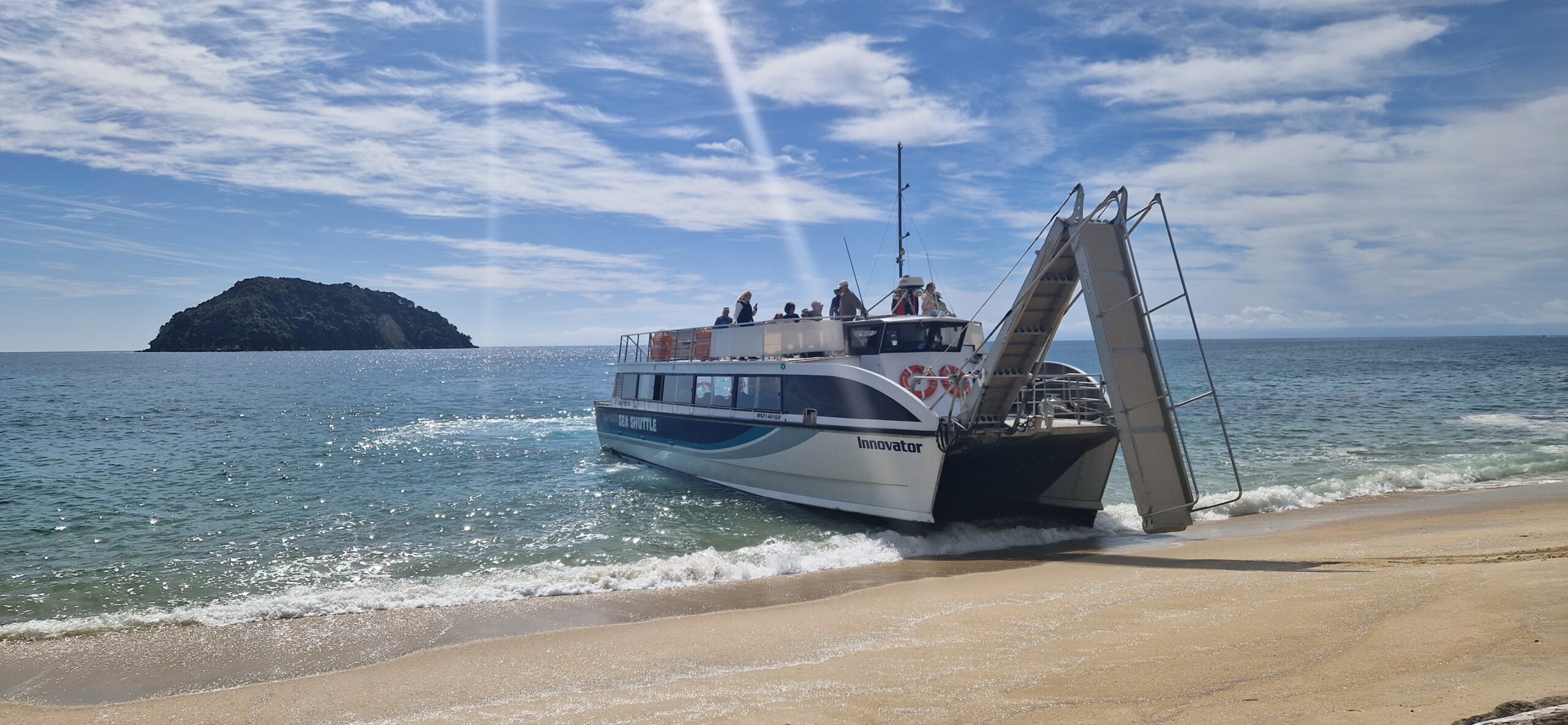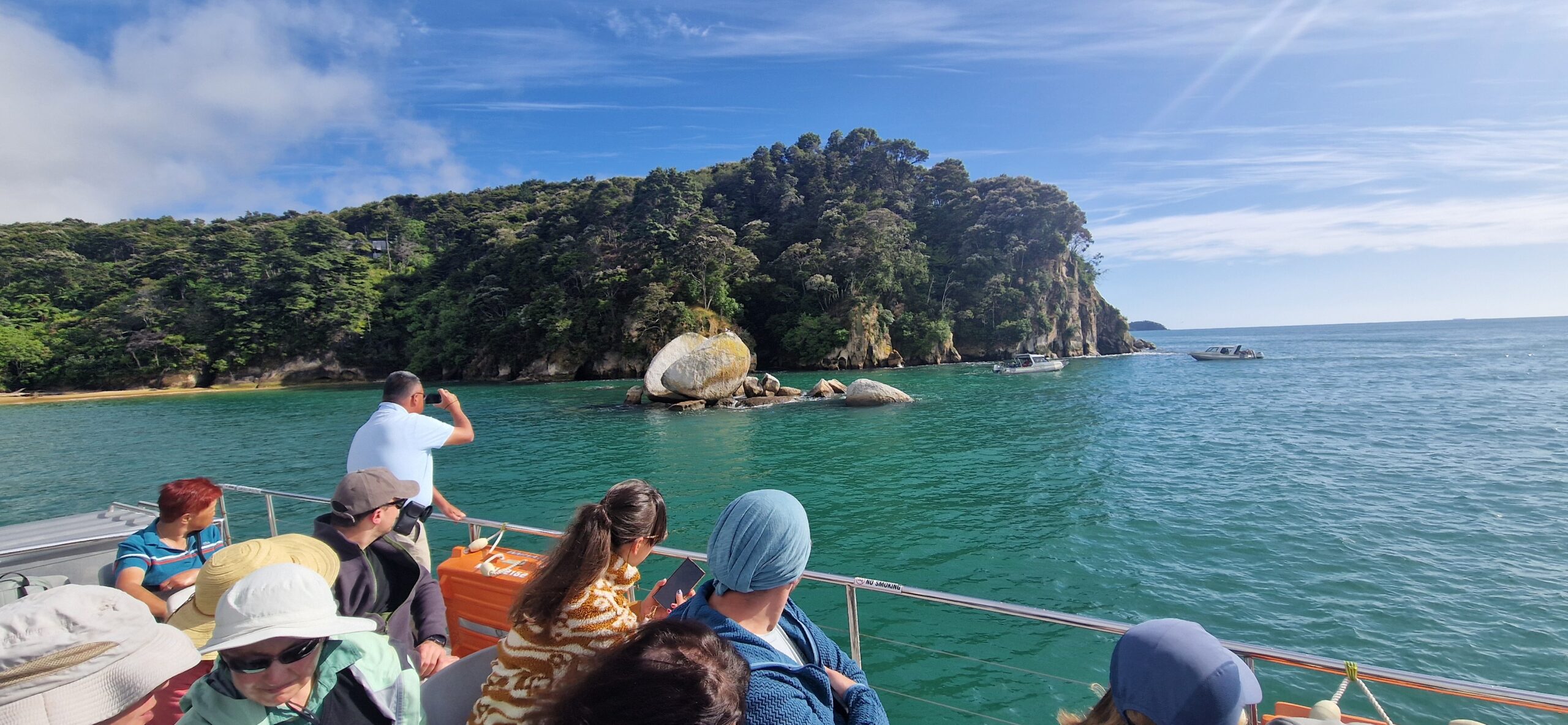 Sejlturen fra Kaiteriteri til vores start sted, båden var inde flere steder for at sætte andre vandre af som havde valgt en anden tur.