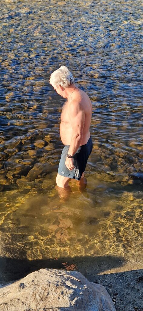 Det var en varm tur op og ned af bjerget. Så vi hoppede i vandet ved en strand, nogle hundrede meter fra hvor vi boede.