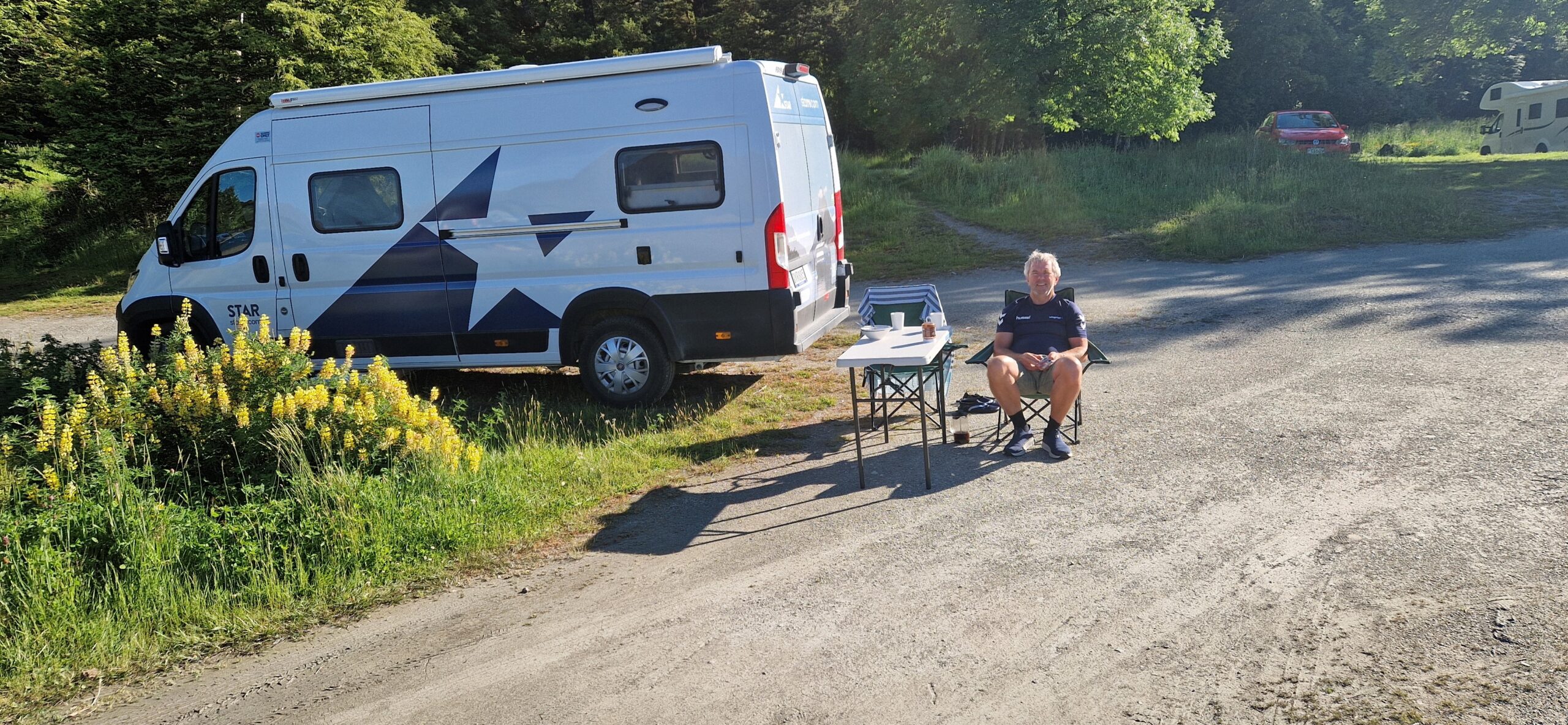 Der var omkring 20-30 vogne på pladsen, som er en “free” plads, dog betales et lille beløb via hjemmeside, tillidsbaseret.