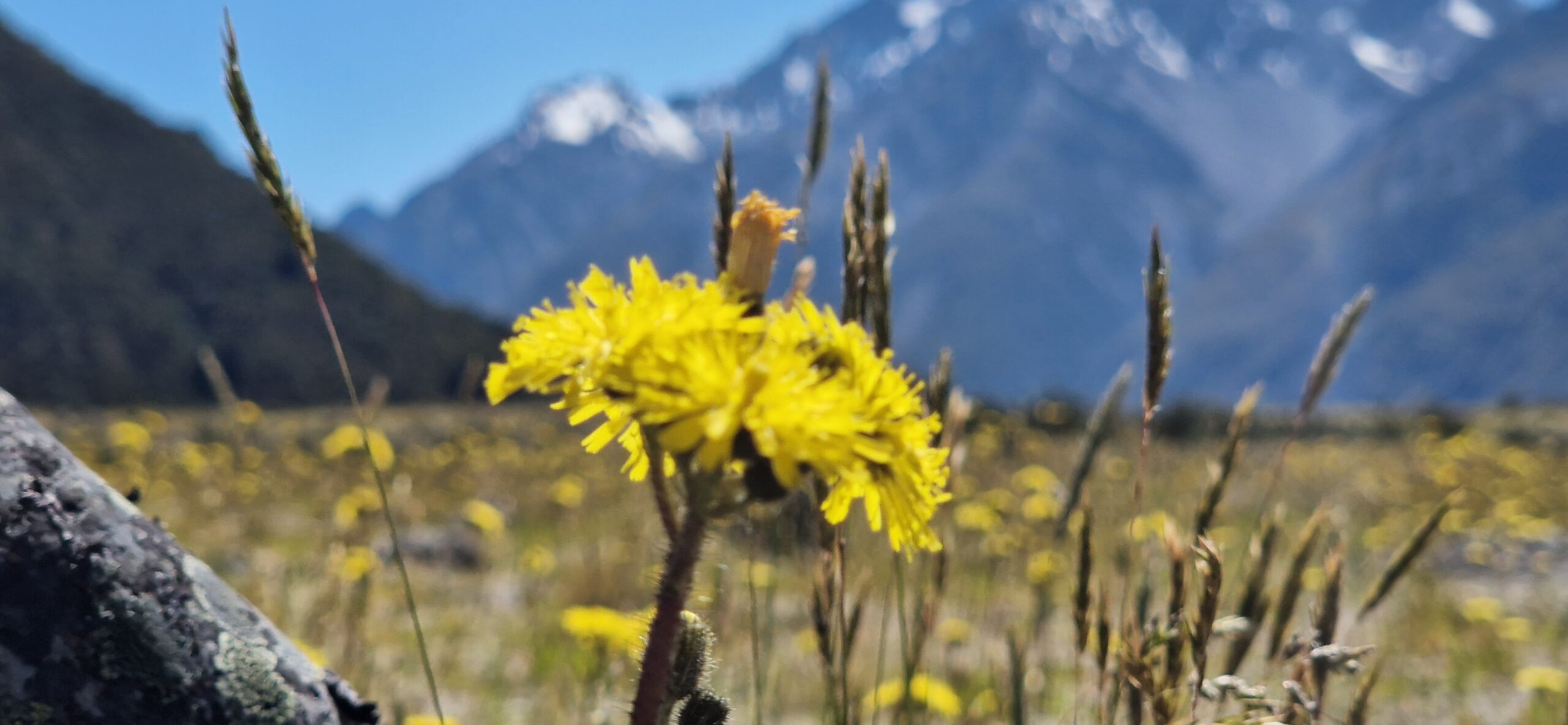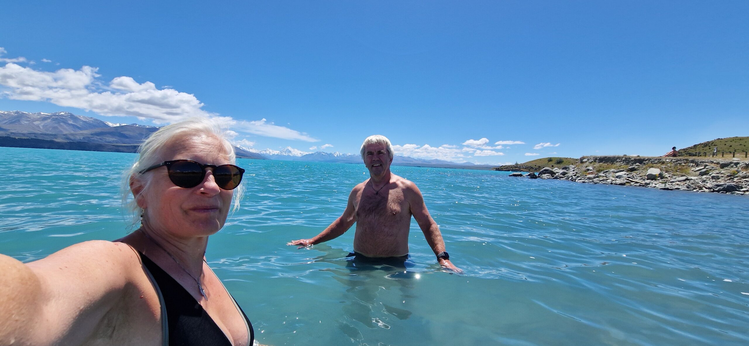 Vi solbader i højfjeldssolen lidt tid og kørte så over til den næste store sø , Tekapo