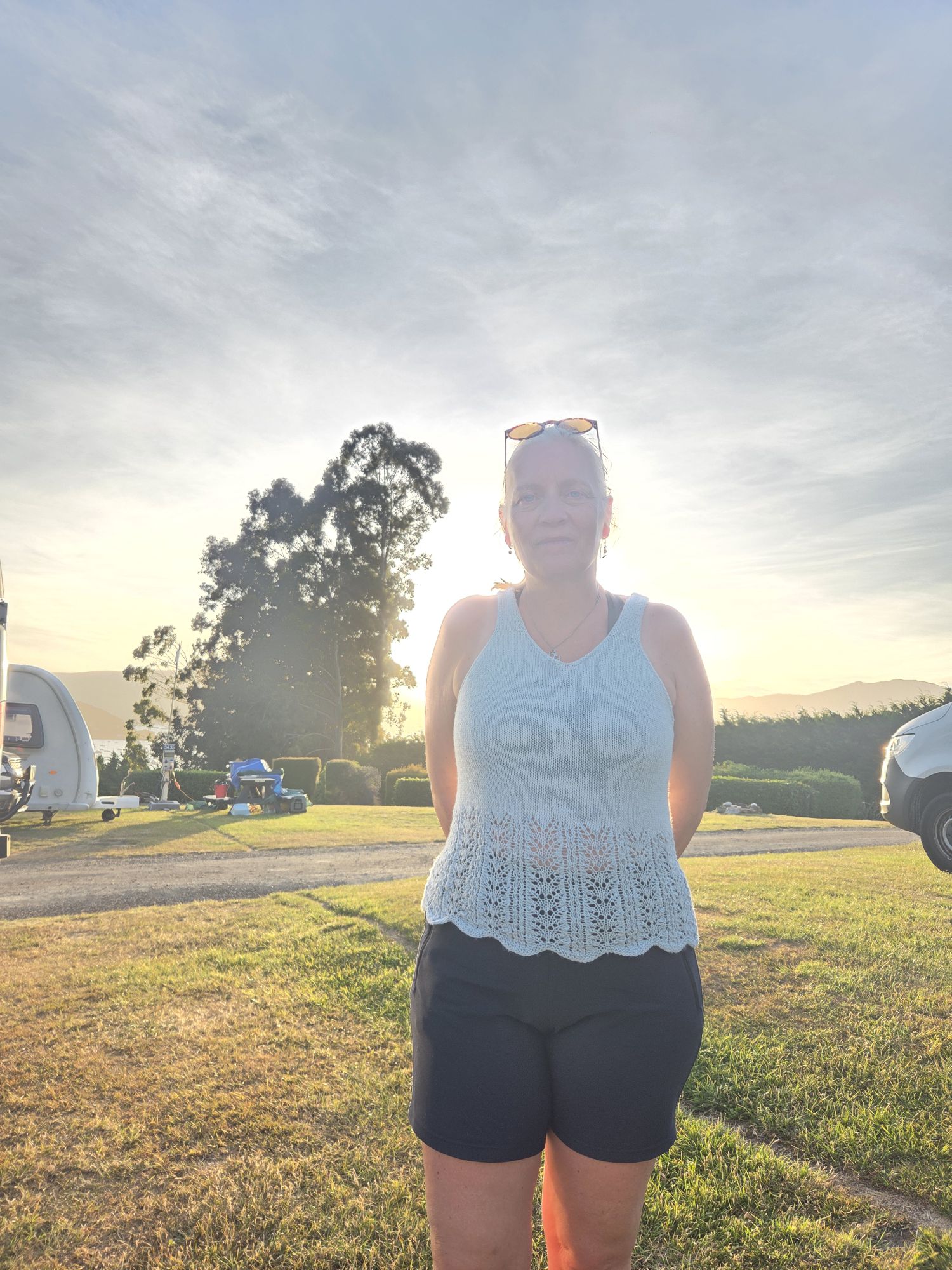 Ved turens start begyndte Anni på at strikke en top. Den er netop blevet færdig…