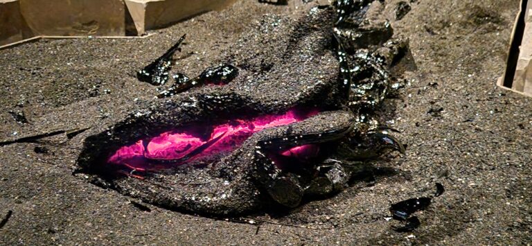 Dette er Lavaen efter showet som er blevet foldet sammen, men stadig er glødende, det holder på varmen meget længe.