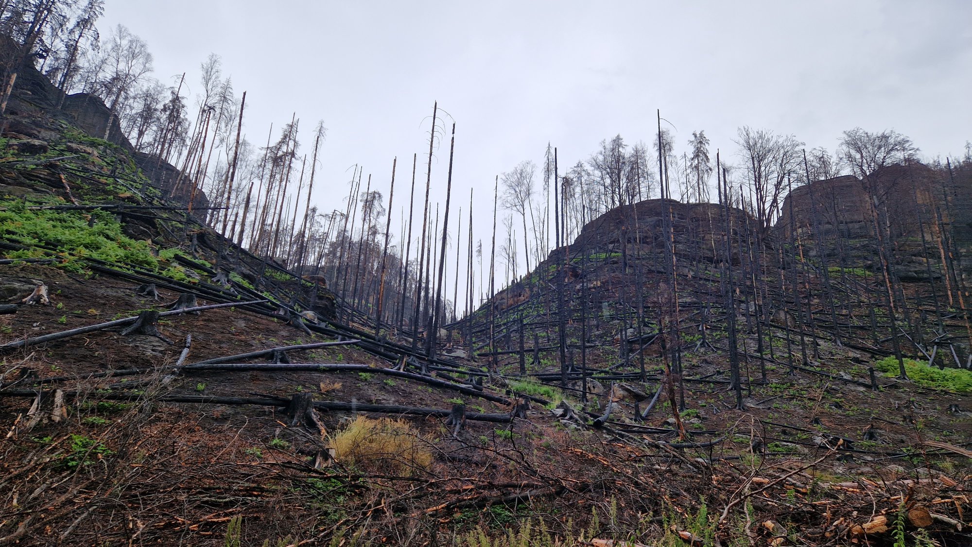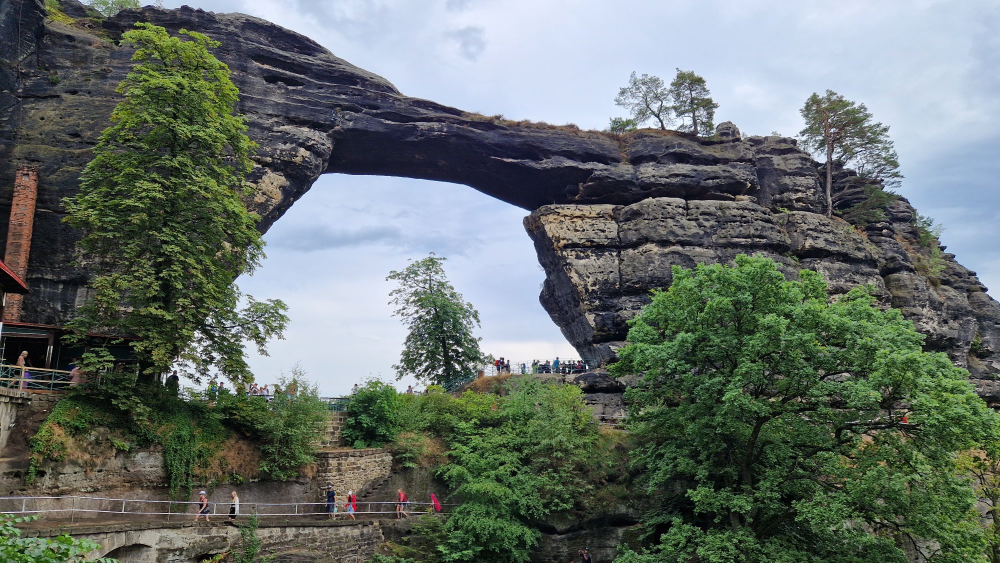 Mandag blev så brugt på at cykle til Hrensko, og vandre tur til Pravcická brána hvor vi så Europas største naturlige sandstens bro. Rigtig flot og en utrolig udsigt, samtidig skræmmende at se hvad skovbrand sidste sommer 2022 har forvoldt af skade og at det tager langtid før skoven har reetableret sig. Vi cyklede sammenlagt 36,5 km med mange vilde stigninger og nedkørsler på 8 og 10% og 7,5 km gang.