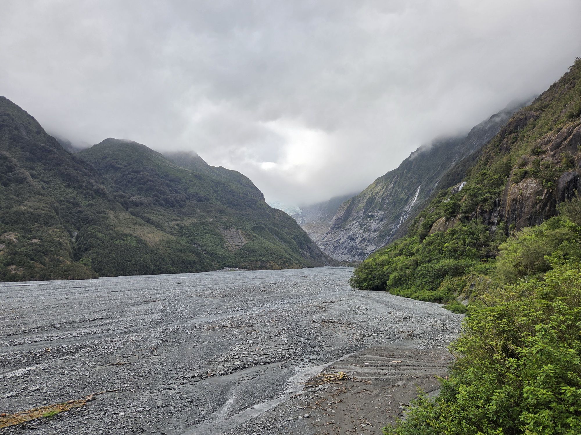 5. December 2025 Fin morgen men der var stadig skyer på toppen. Så vi måtte aflyse vores tur i Helikopter til gletsjerne. Øv Istedet kørte vi hen og kiggede på dem nedefra : både Franz Josef og Fox. Fox gletsjer…