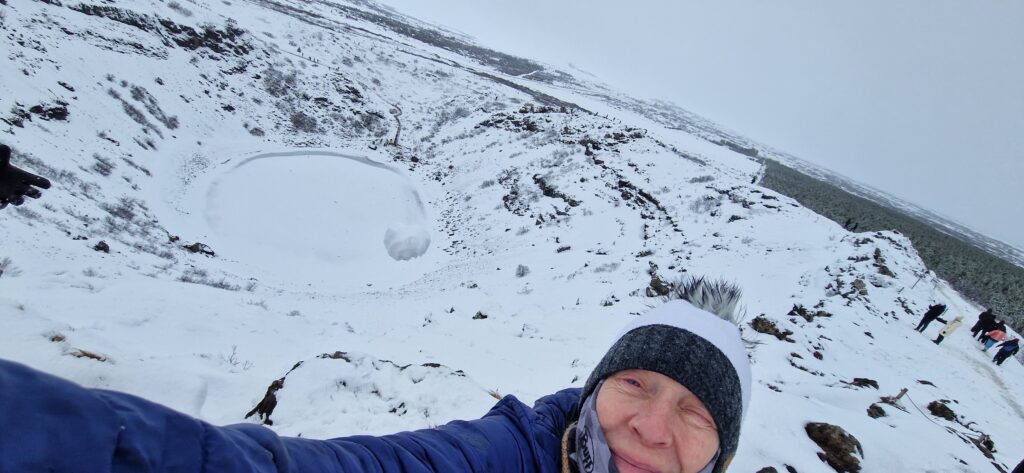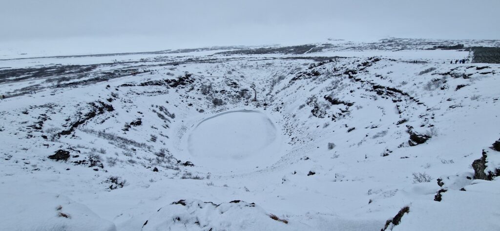 Vi kørte ud af byen i en masse ny sne og der kom mere mens vi kørte. Flere steder kom der så meget at det var svært at kører og hastigheden måtte sættes meget ned. Da vi nærmede os Selfloss besluttede vi at vejene var fine nok til at vi turde kører op og se Kerið Krater selv om det hele nok bare var hvidt. Vi havde jo masser af tid da vi forventede at det ikke ville være muligt at komme ind det nye sted før kl. 17.