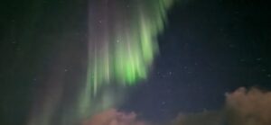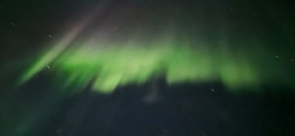 Kl. 22:00 da Frederik endelig var færdig hoppede vi ud i vildmarksbadet og sad så der i mere end en time mens vi så på stjerner og nordlys.