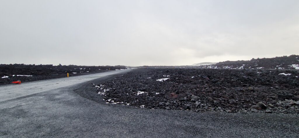kl. var nu ca. 15 så vi besluttede at kører til Grindavík, som jo var ramt af vulkan udbrud i 2024. På vejen der til kørte vi pludselig midt i meget ekstra sort lava (nyt) vejen var også ny og der stod at vi ikke måtte stoppe på vejen.