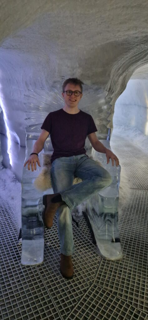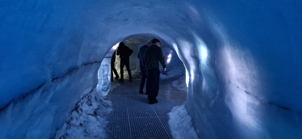 Vi prøvede også at gå i en gletsjer ishule, minus 15 grader. Bemærk Frederik i t-shirt.