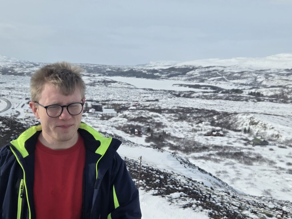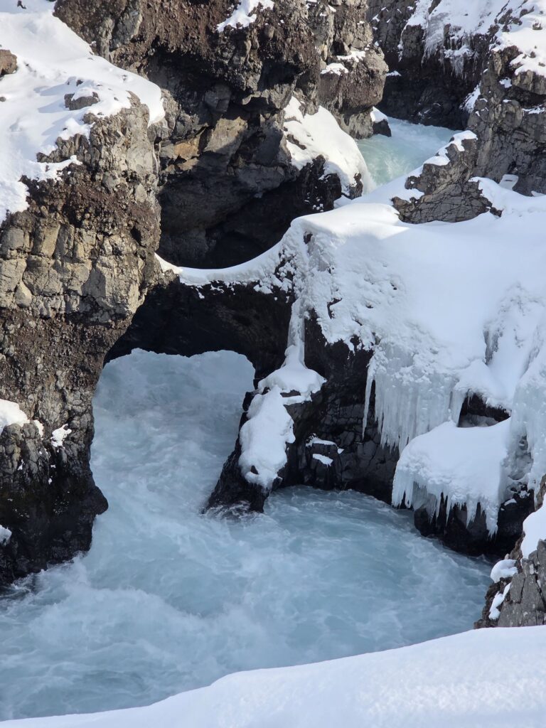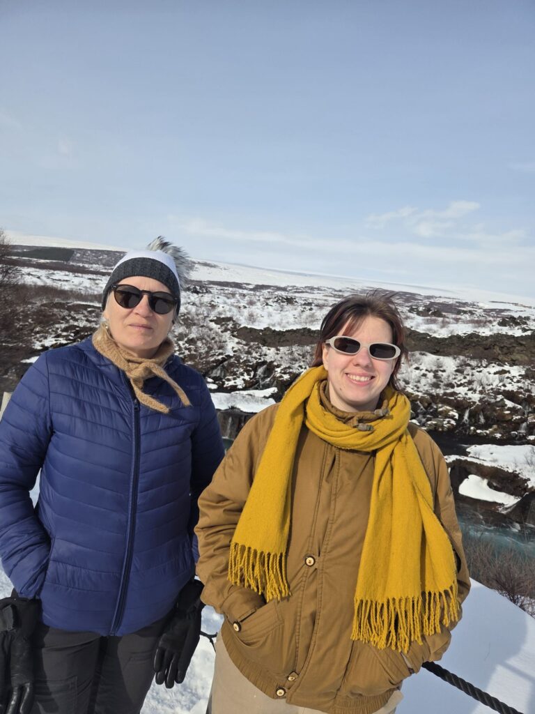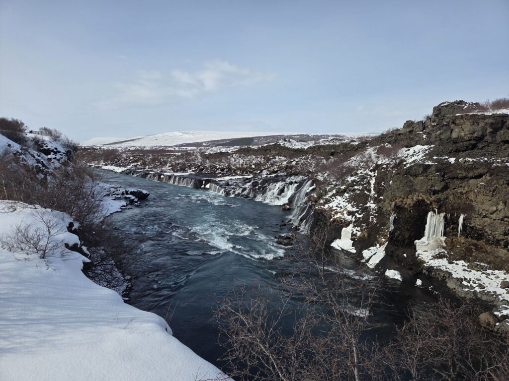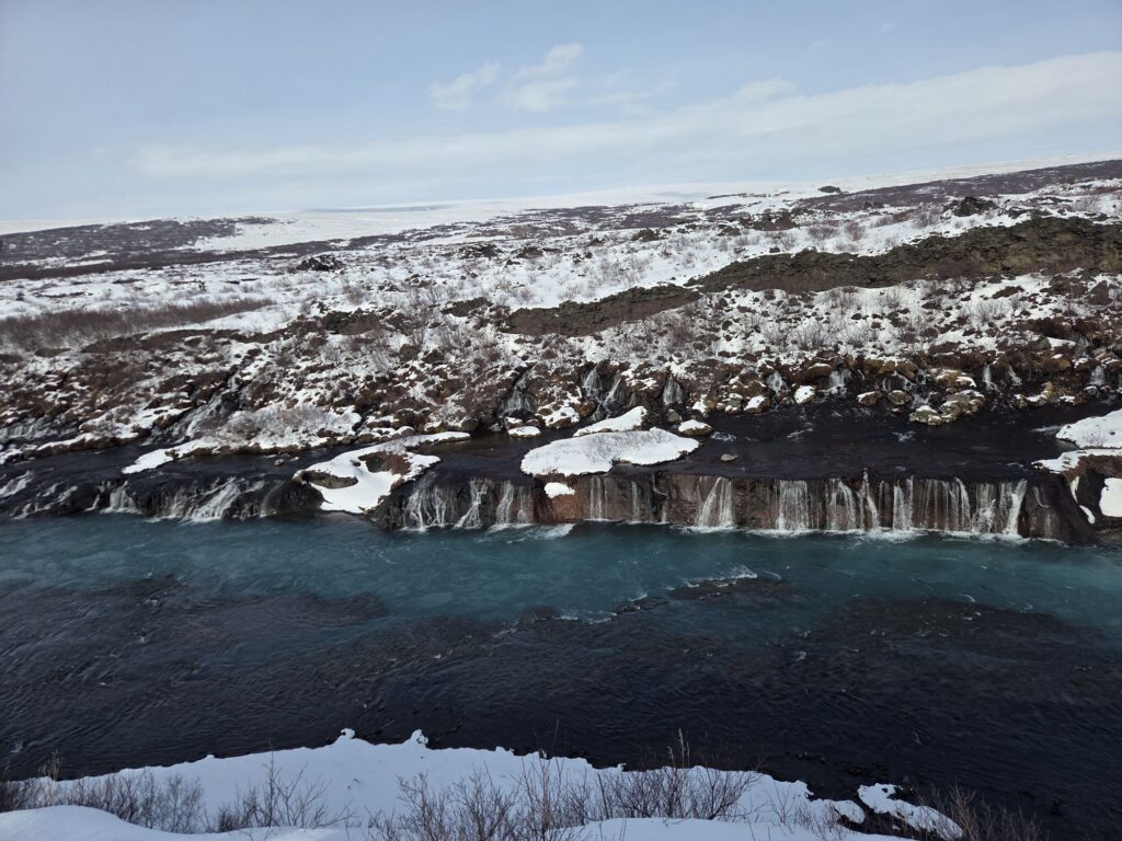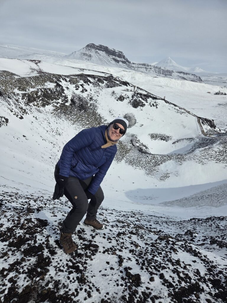 Vi kørte godt 100 km mod nord for at se vulkankratere ved byen Bifrost. Det var virkelig flot da vi havde kæmpet os op ad bjerget med udforderne meget sne på sti og trapper.